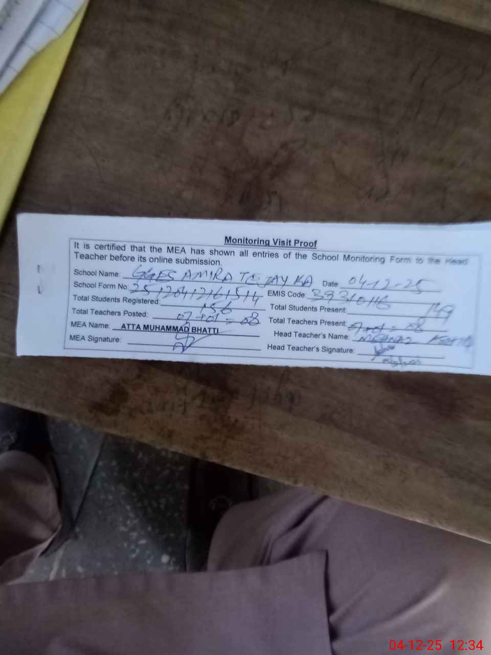 | Attendance Register | Head Teacher | MEA with School | Visit Proof |