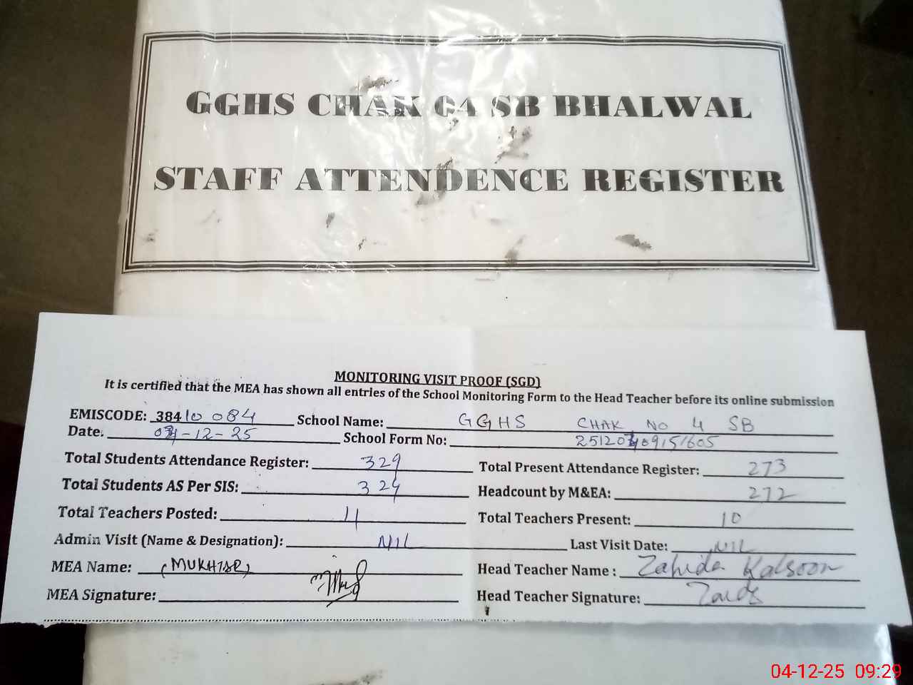 | EMIS Code: 38410084 | Name of School: GGHS CHAK NO.4 SB | |||
