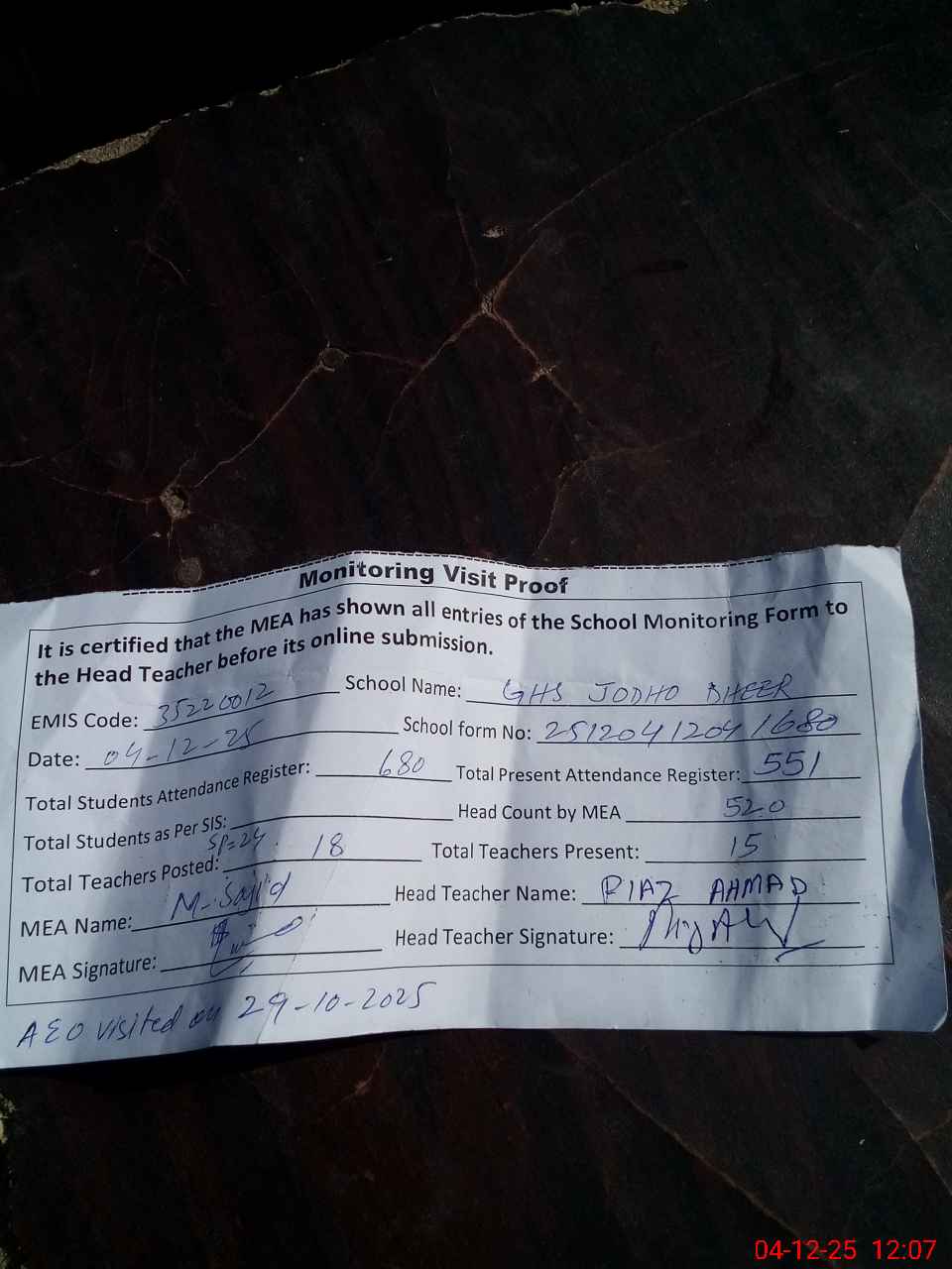 | EMIS Code: 35220012 | Name of School: GHS JODHO DHEER | |||
