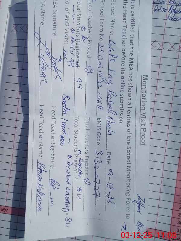 | Attendance Register | Head Teacher | MEA with School | Visit Proof |