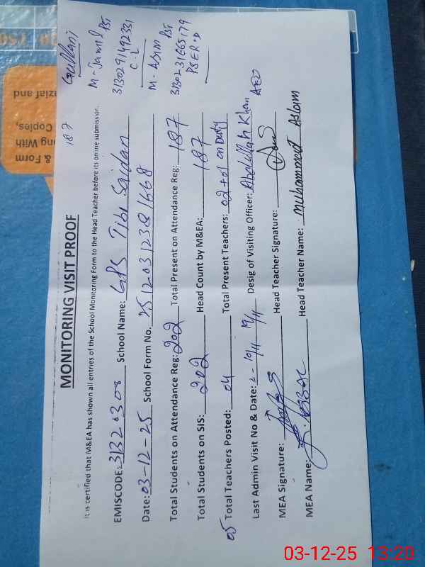 | Name: MU**** JA**** Designation: (School Headmaster's/Headmistress's) PST/PTC/JV Phone/Cell Number: 03**** |