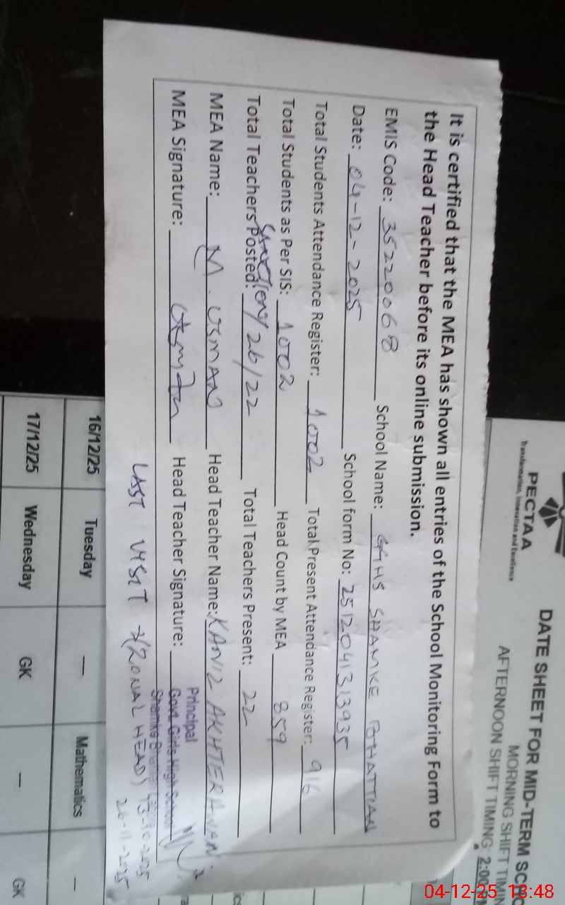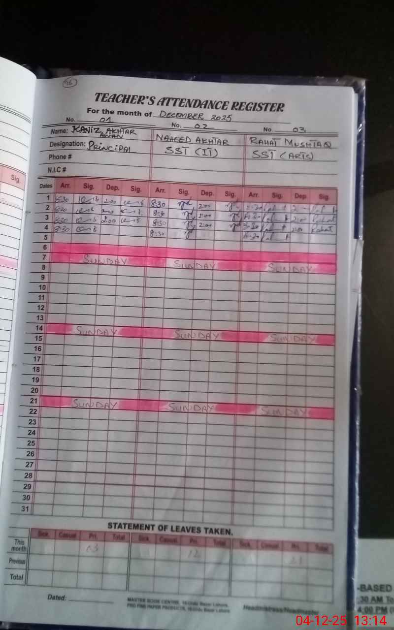 | Remarks (Use Separate Page if Required): 01 teacher named Sahar Munir PST is long absent since 01 February 2025 02 wash rooms are nonfunctional due to sewerage problem 02 class rooms are under construction from current month | |||||