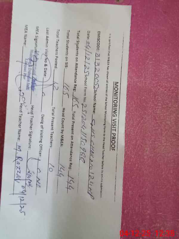 | Attendance Register | Head Teacher | MEA with School | Visit Proof |