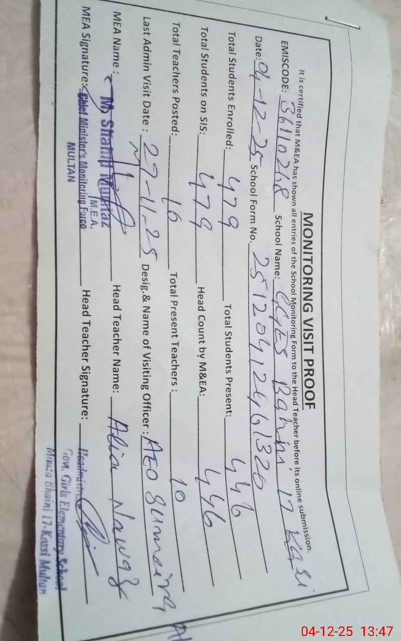 | EMIS Code: 36110268 | Name of School: GGES BHAINI BHUDLA ROAD MULTAN | |||