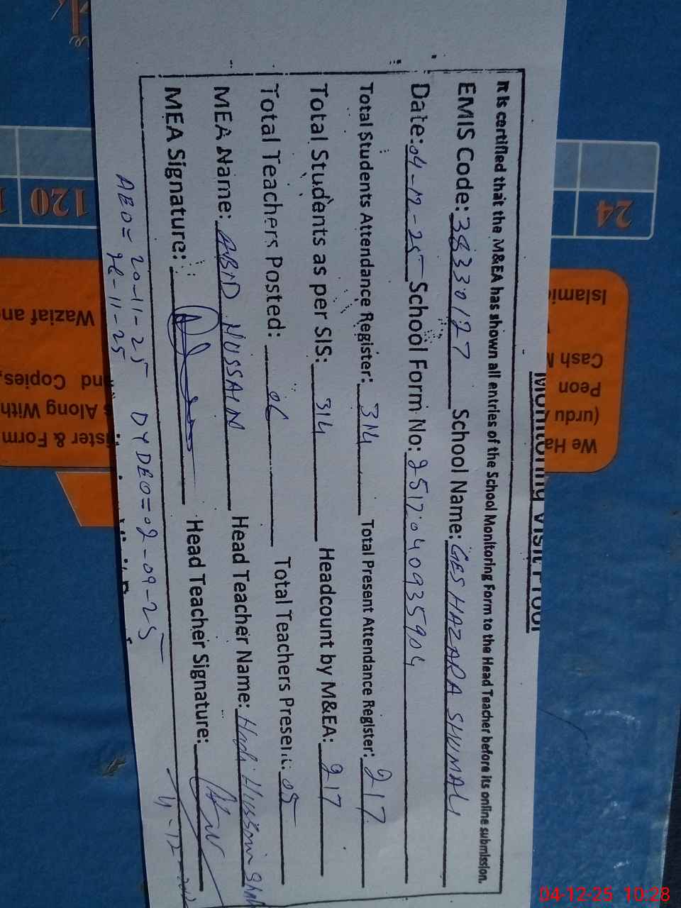| Attendance Register | Head Teacher | MEA with School | Visit Proof |