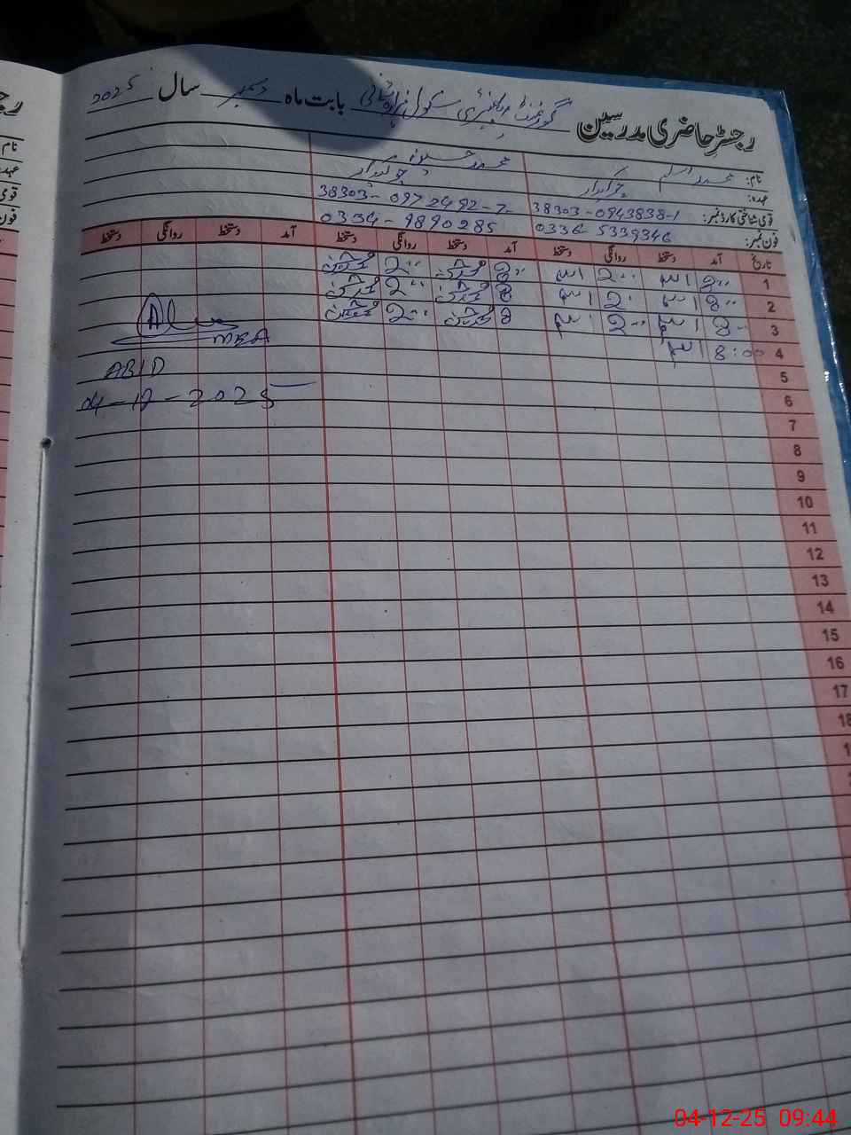 | CNIC | Full Name | Designation | R/C | Absence during last cal. month |