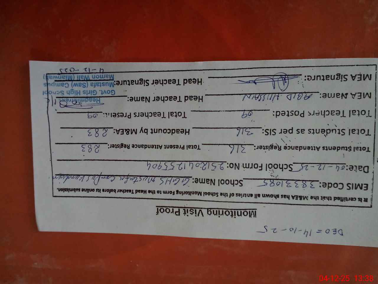 | Attendance Register | Head Teacher | MEA with School | Visit Proof |
