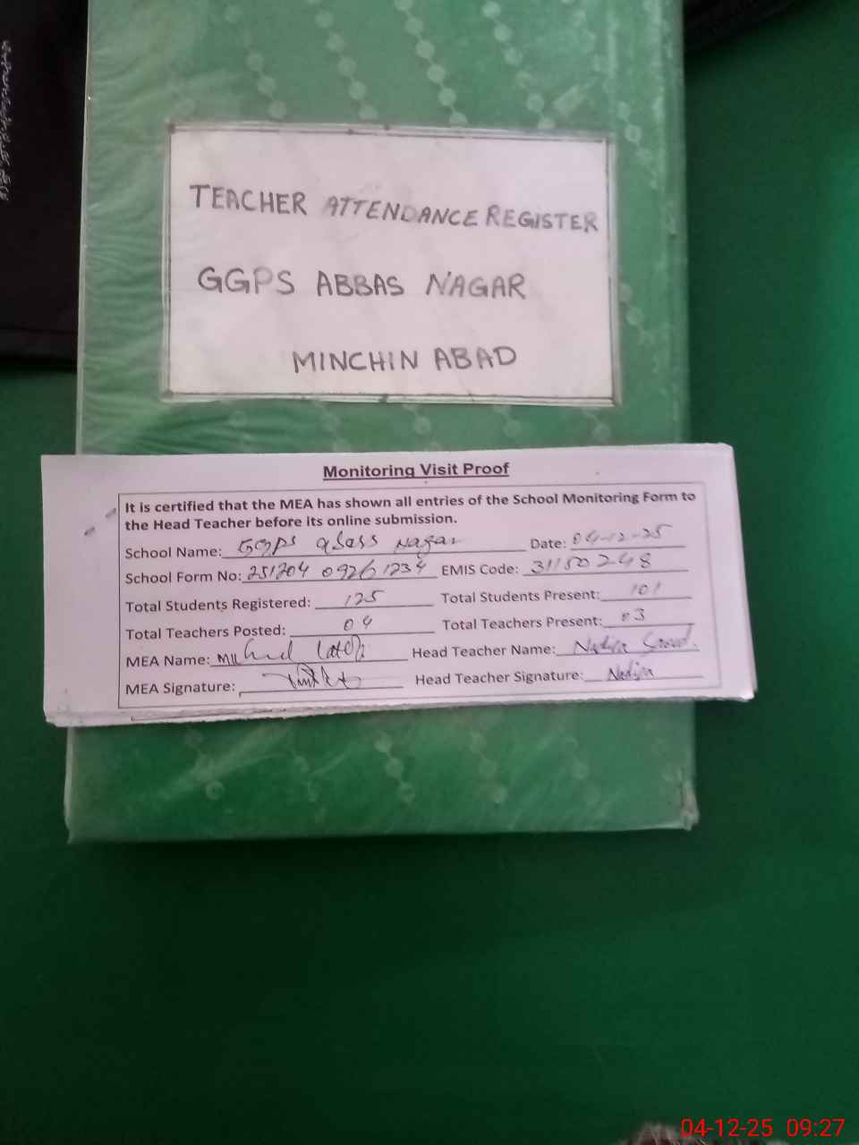 | Attendance Register | Head Teacher | MEA with School | Visit Proof |