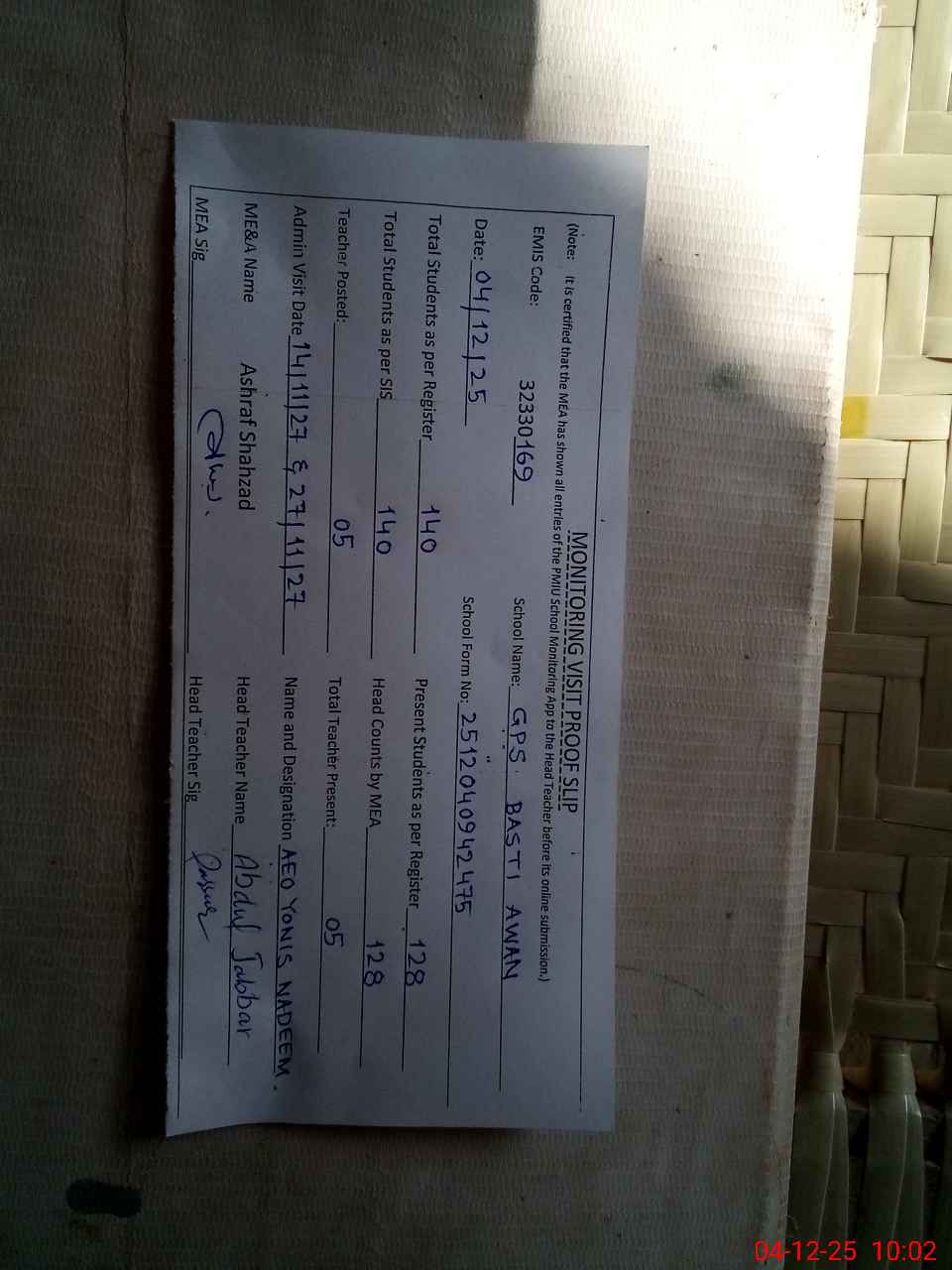 | Attendance Register | Head Teacher | MEA with School | Visit Proof |