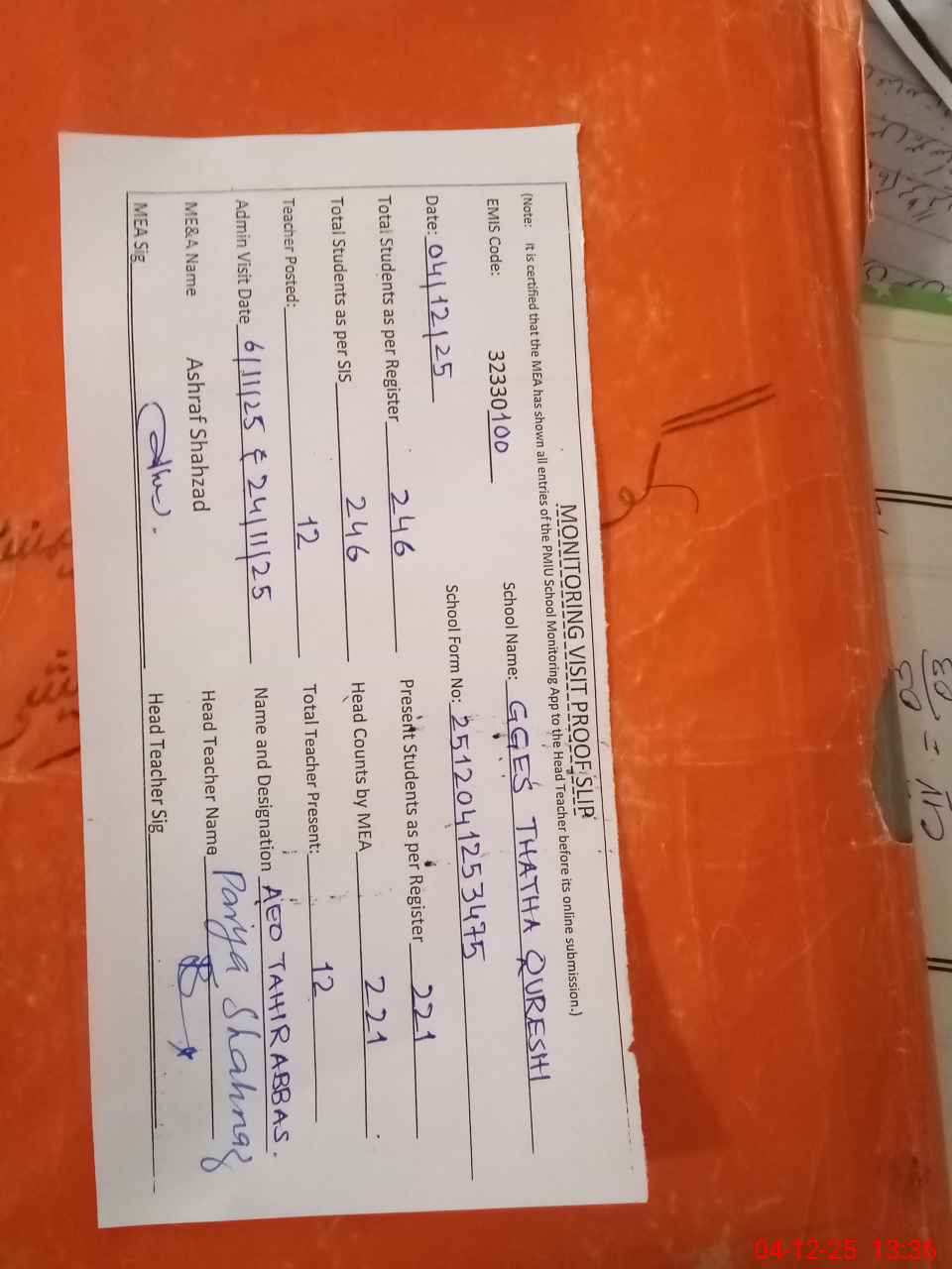 | Attendance Register | Head Teacher | MEA with School | Visit Proof |