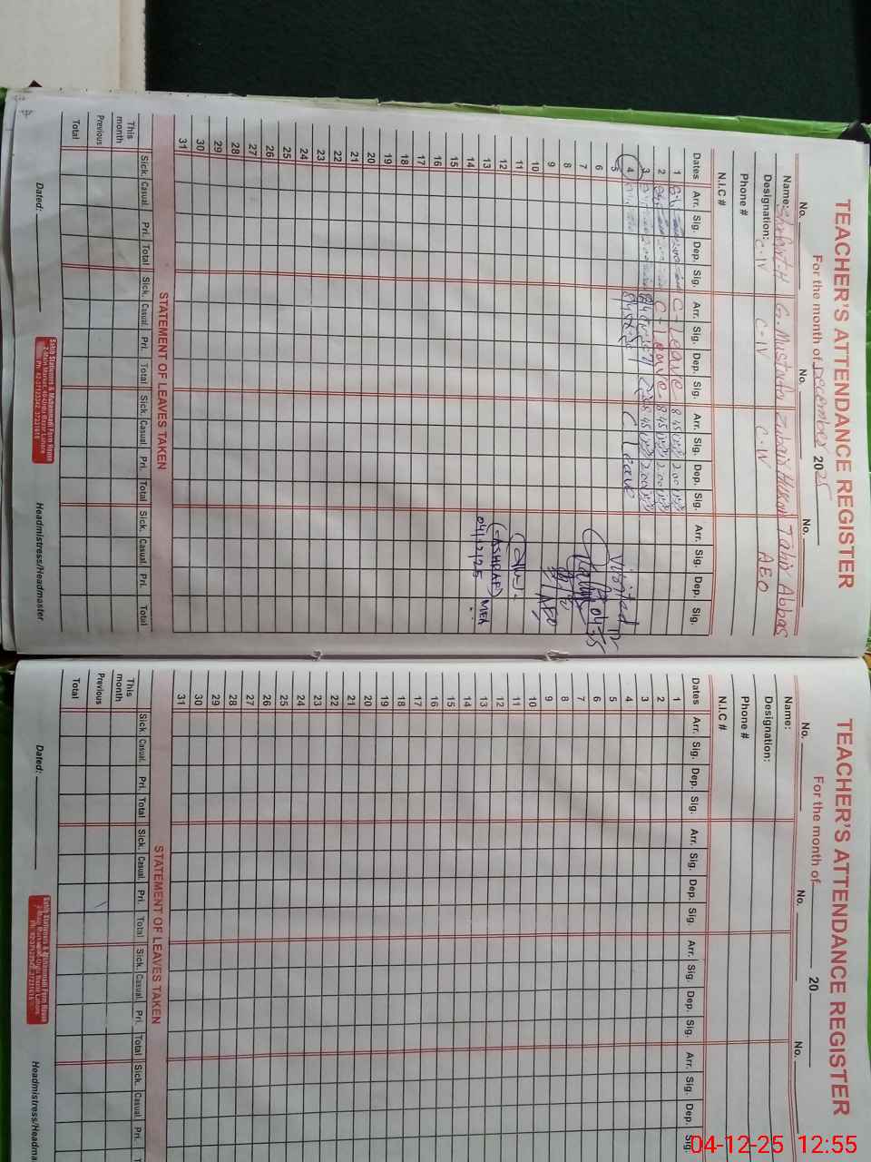 | CNIC | Full Name | Designation | R/C | Absence During Last Calender Month |