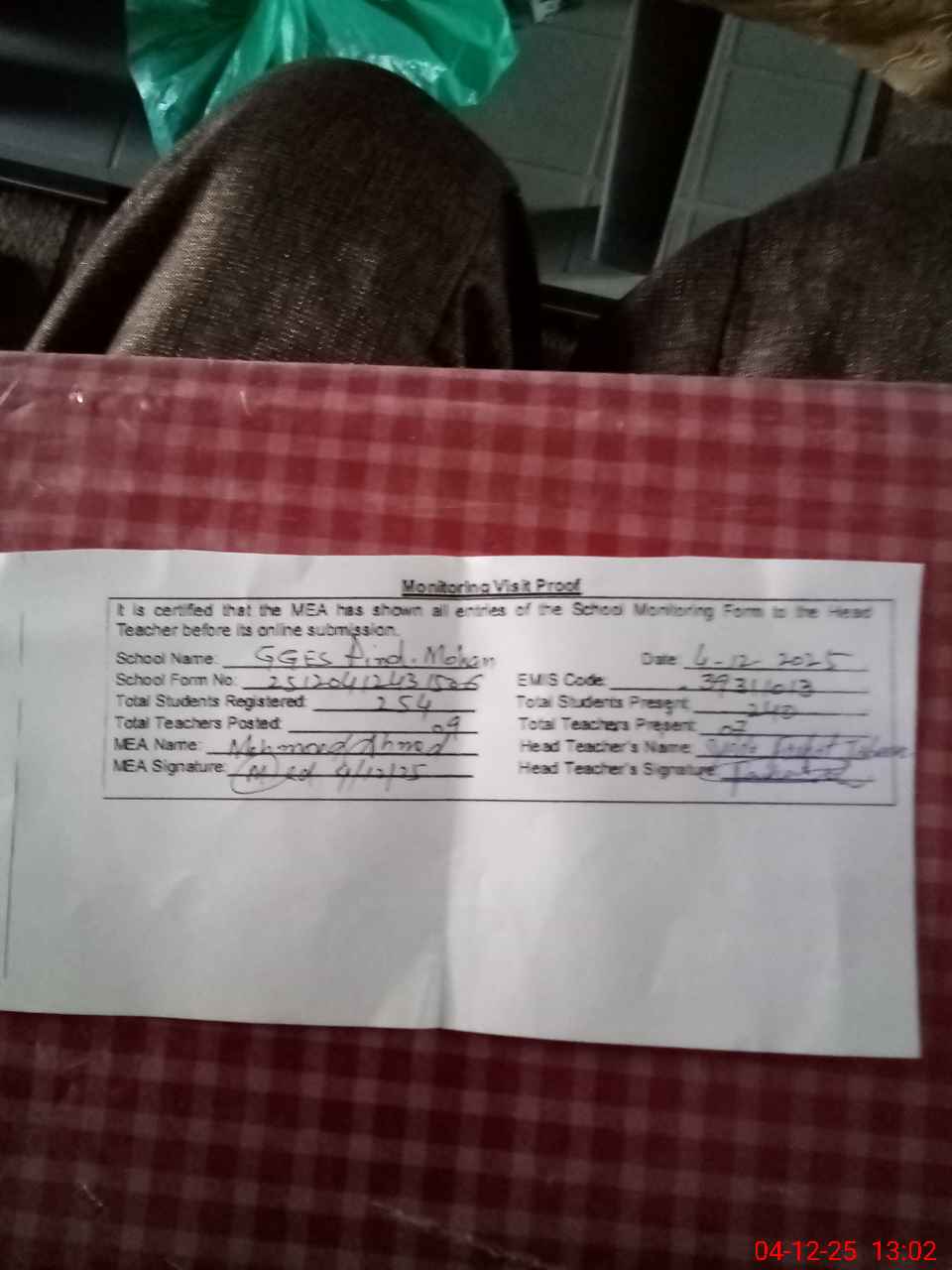 | EMIS Code: 39311013 | Name of School: GGES CHAK PINDI MOHLAN | |||