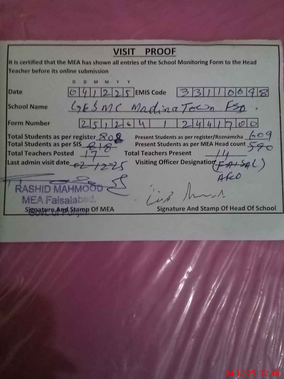 | Certified that this School was Inspected by the Undersigned MEA/DMO Today and the Information Stated Above is as Per Record. | |||||