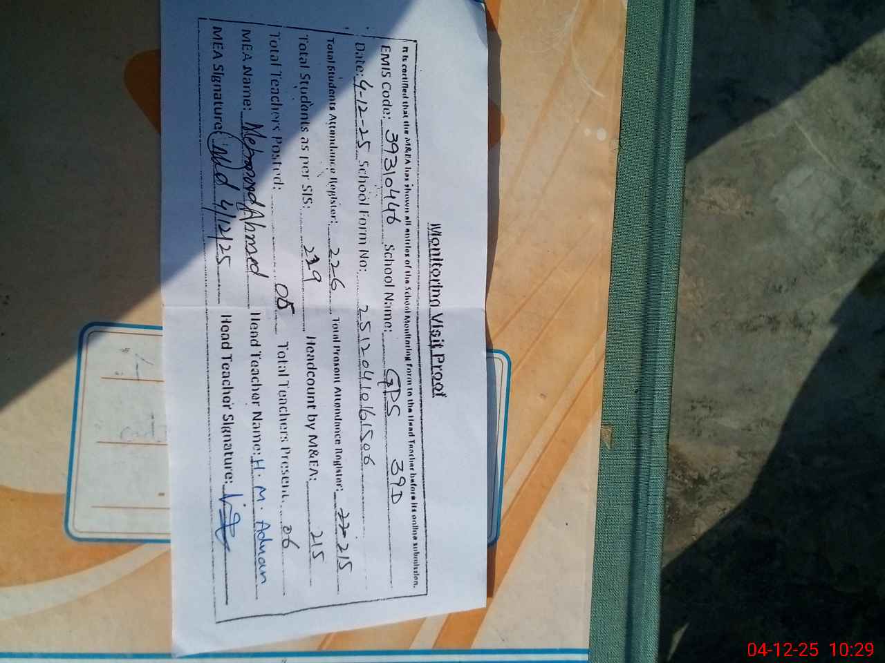 | Attendance Register | Head Teacher | MEA with School | Visit Proof |
