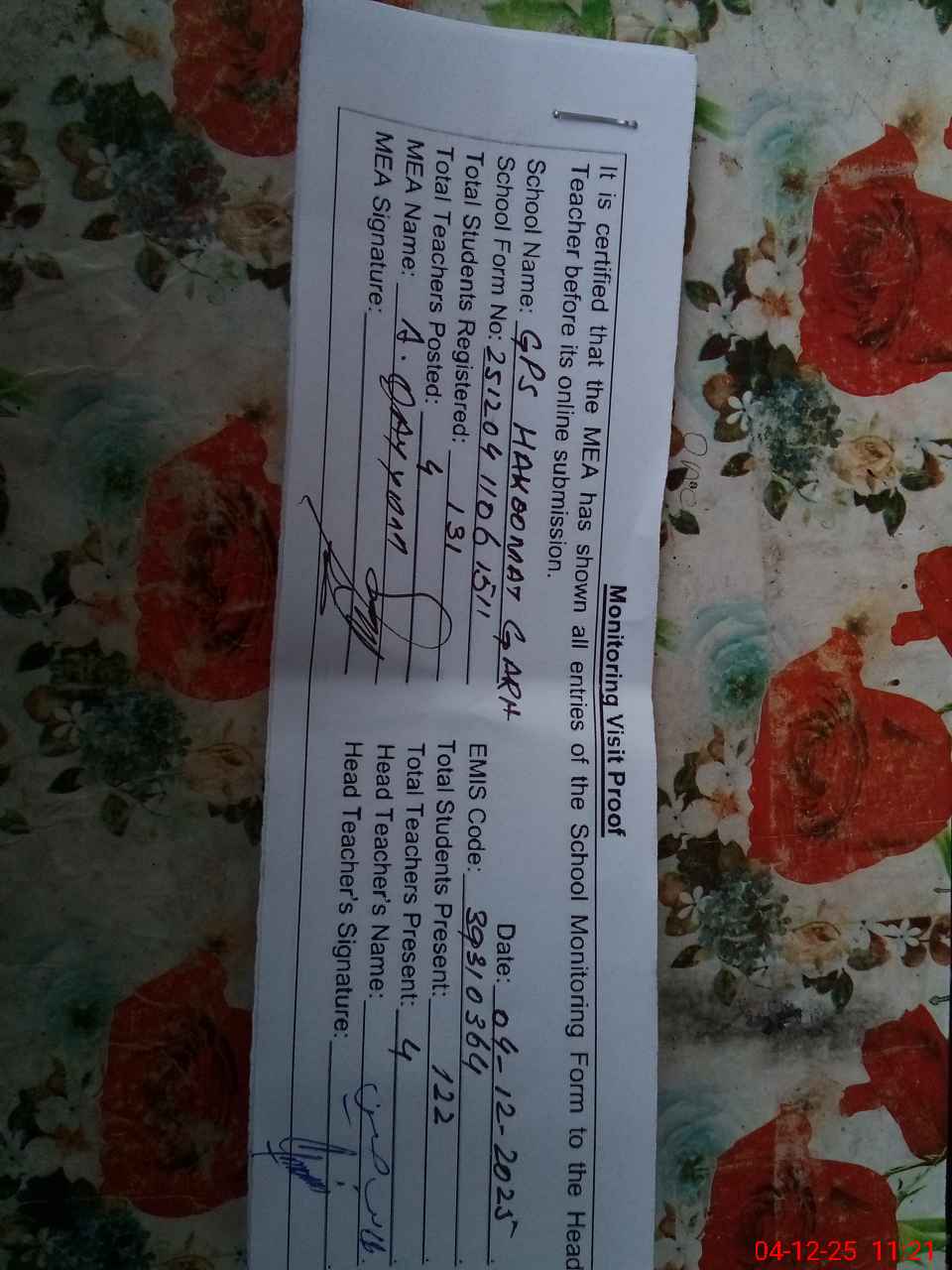| Attendance Register | Head Teacher | MEA with School | Visit Proof |