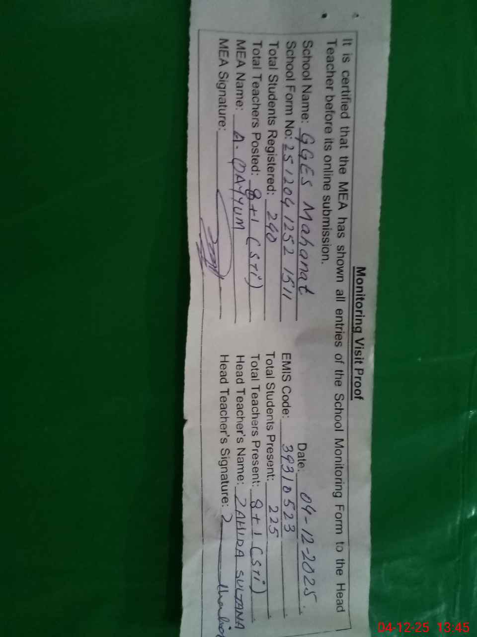 | Attendance Register | Head Teacher | MEA with School | Visit Proof |
