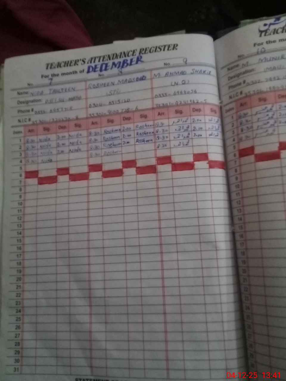 | CNIC | Full Name | Designation | R/C | Absence during last cal. month |