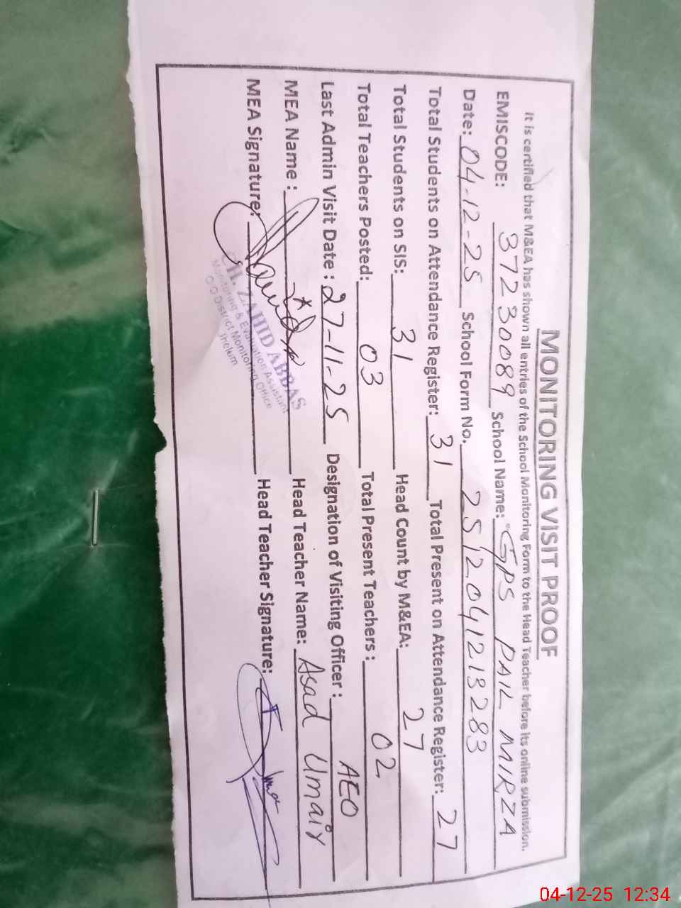 | Attendance Register | Head Teacher | MEA with School | Visit Proof |
