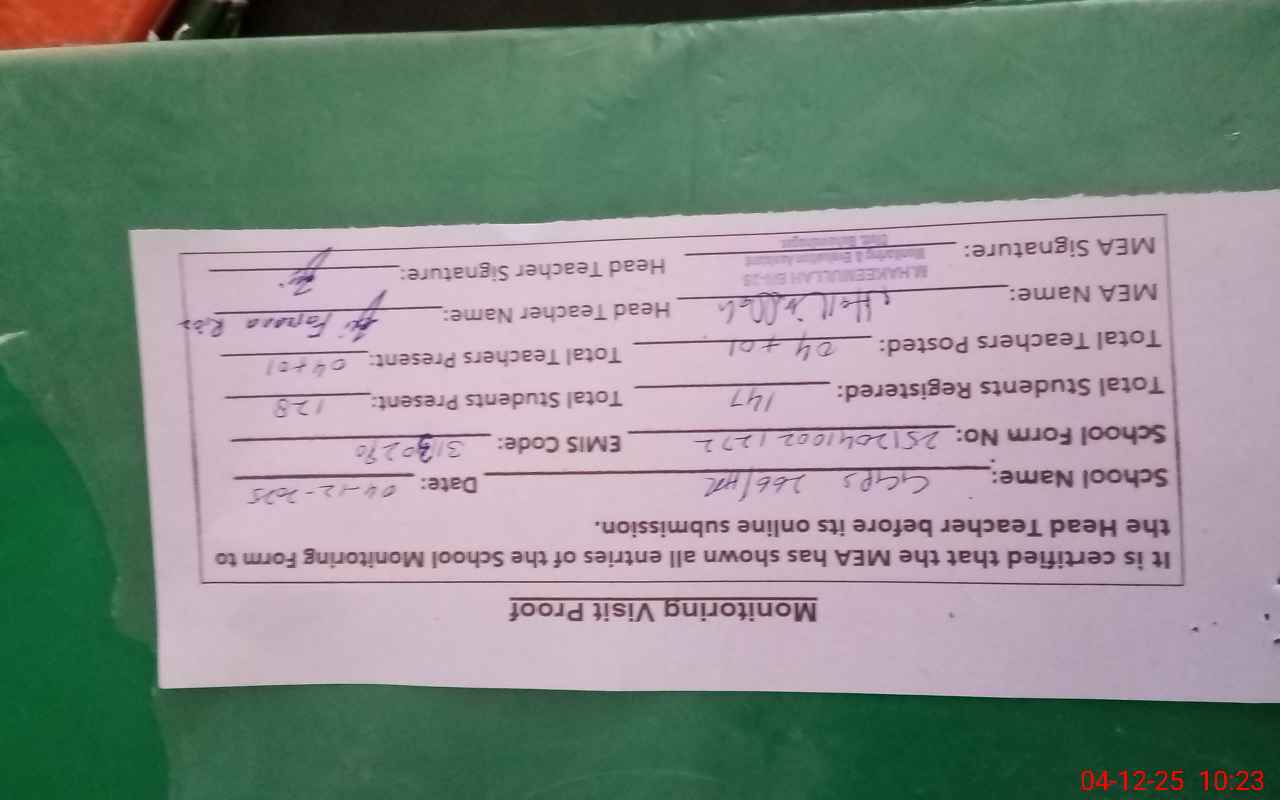 | Attendance Register | Head Teacher | MEA with School | Visit Proof |