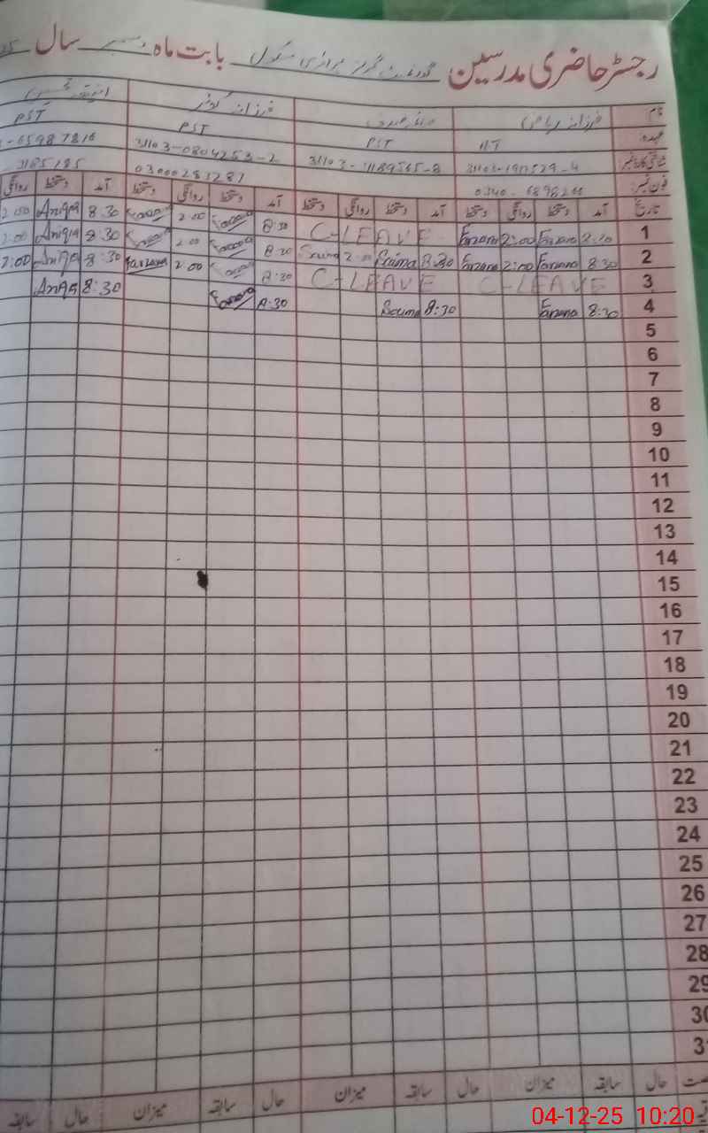 | CNIC | Full Name | Designation | R/C | Absence During Last Calender Month |