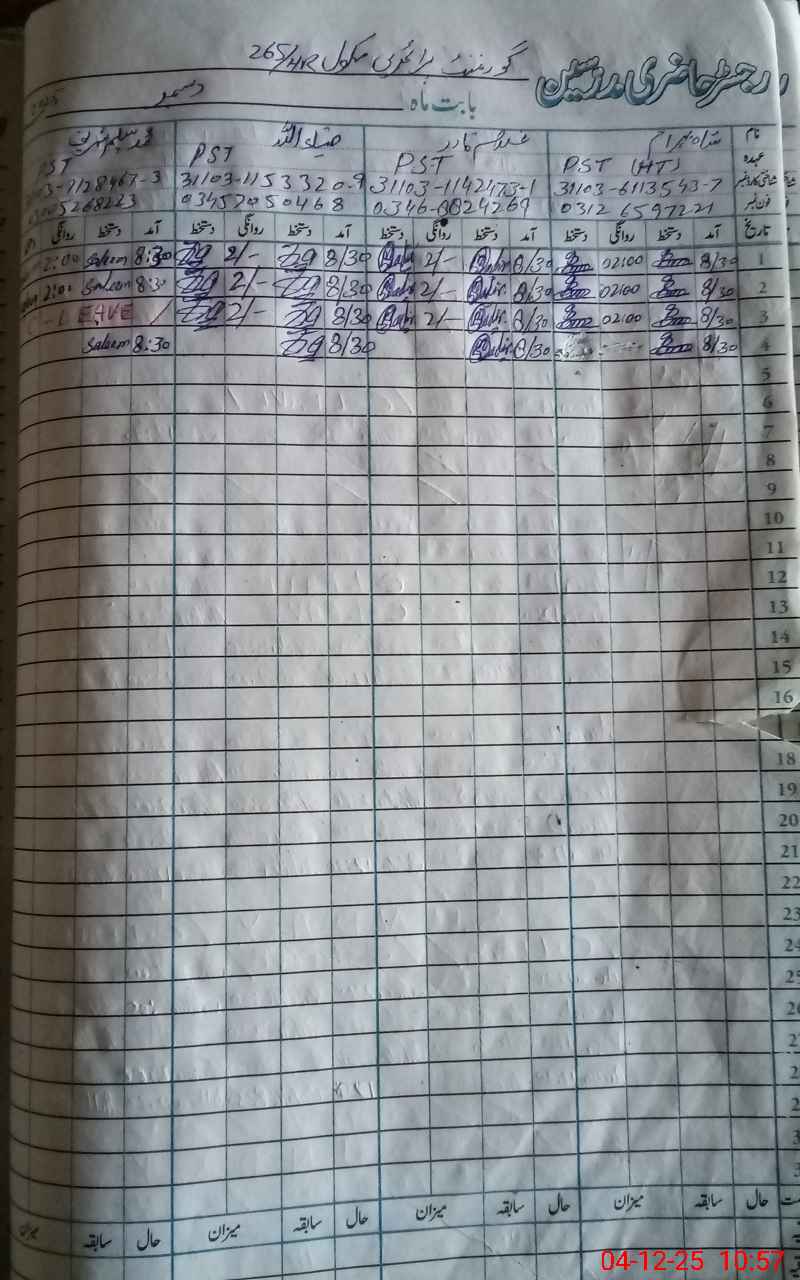 | CNIC | Full Name | Designation | R/C | Absence During Last Calender Month |