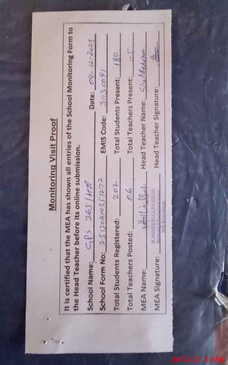 | Attendance Register | Head Teacher | MEA with School | Visit Proof |