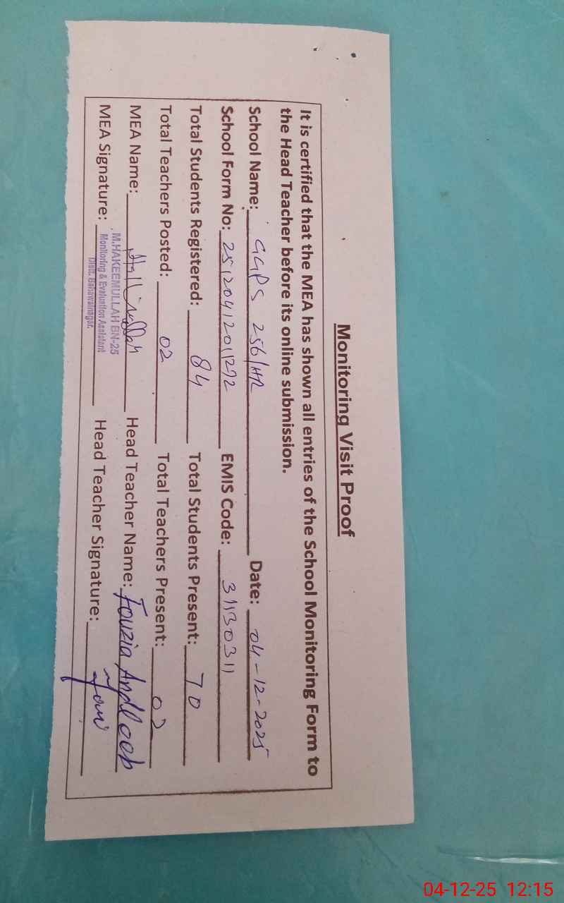| EMIS Code: 31130311 | Name of School: GGPS CHAK NO 256/HR | |||