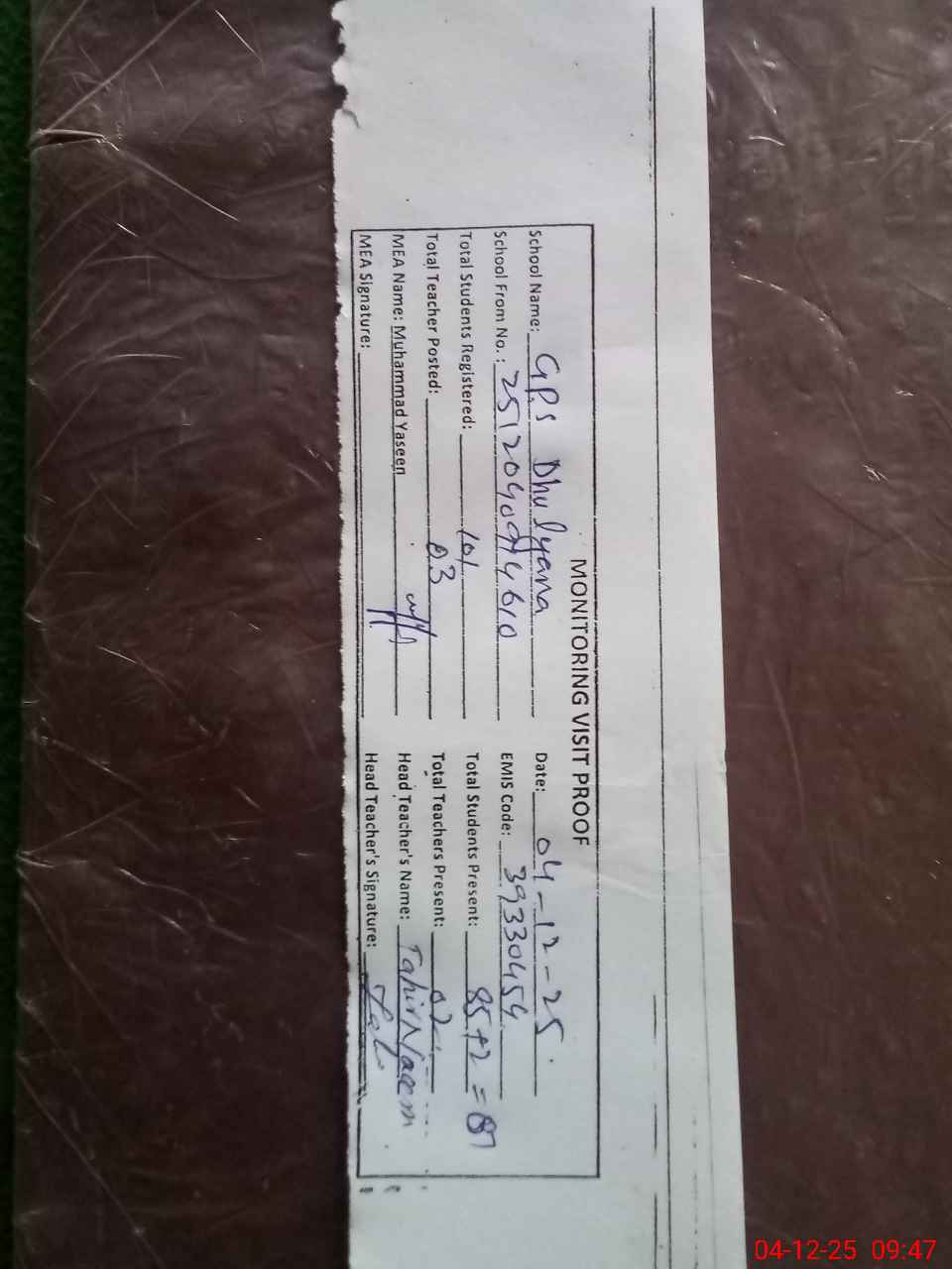 | EMIS Code: 39330454 | Name of School: GPS DHULYANA | |||