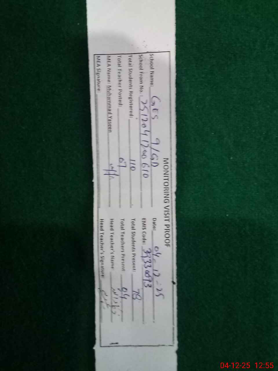 | Attendance Register | Head Teacher | MEA with School | Visit Proof |
