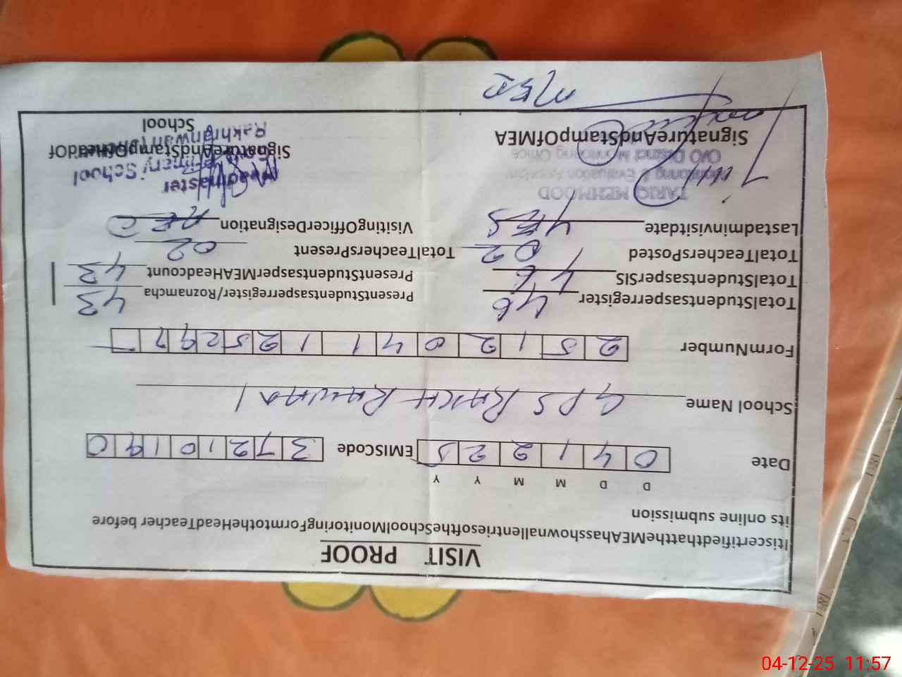 | Attendance Register | Head Teacher | MEA with School | Visit Proof |