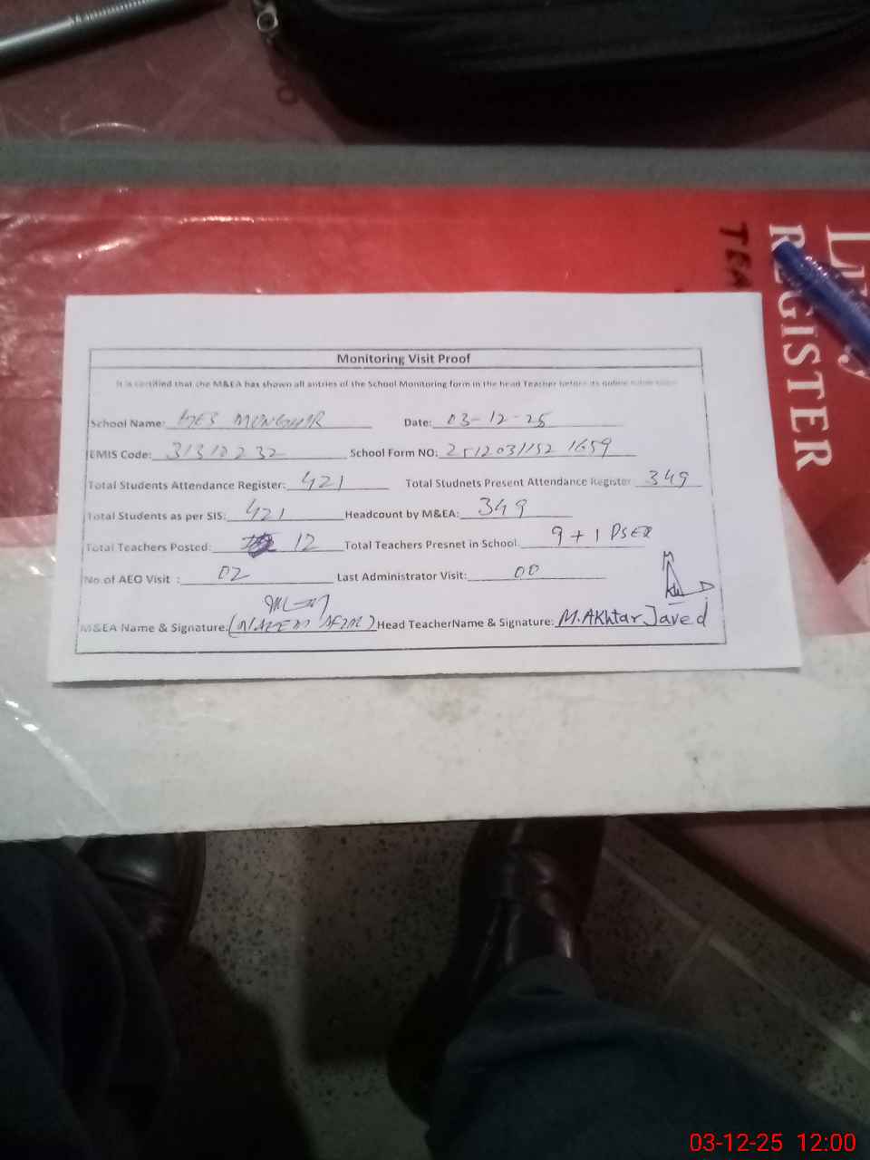 | Attendance Register | Head Teacher | MEA with School | Visit Proof |