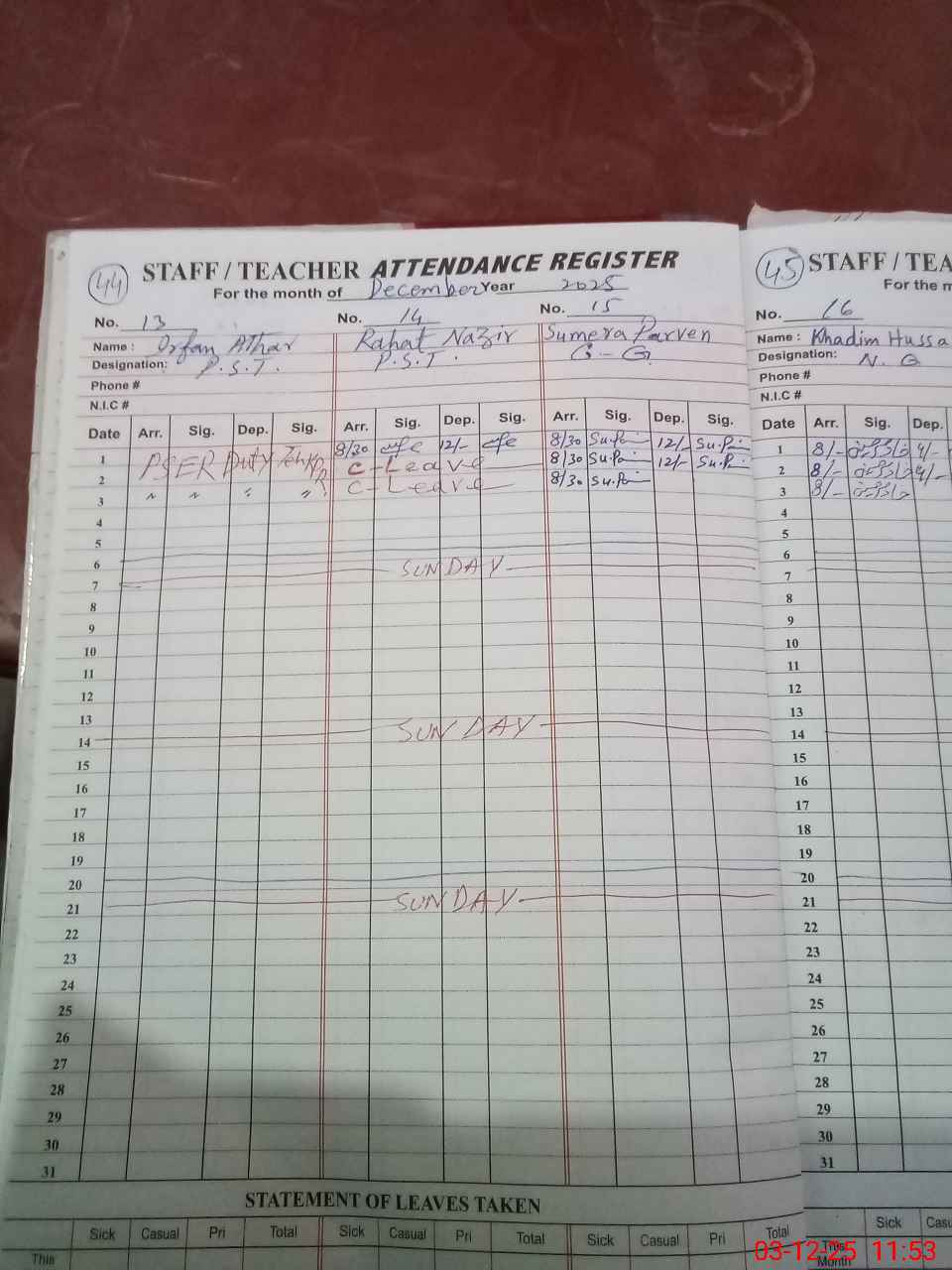 | CNIC | Full Name | Designation | R/C | Absence During Last Calender Month |