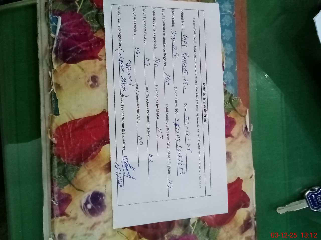 | Attendance Register | Head Teacher | MEA with School | Visit Proof |