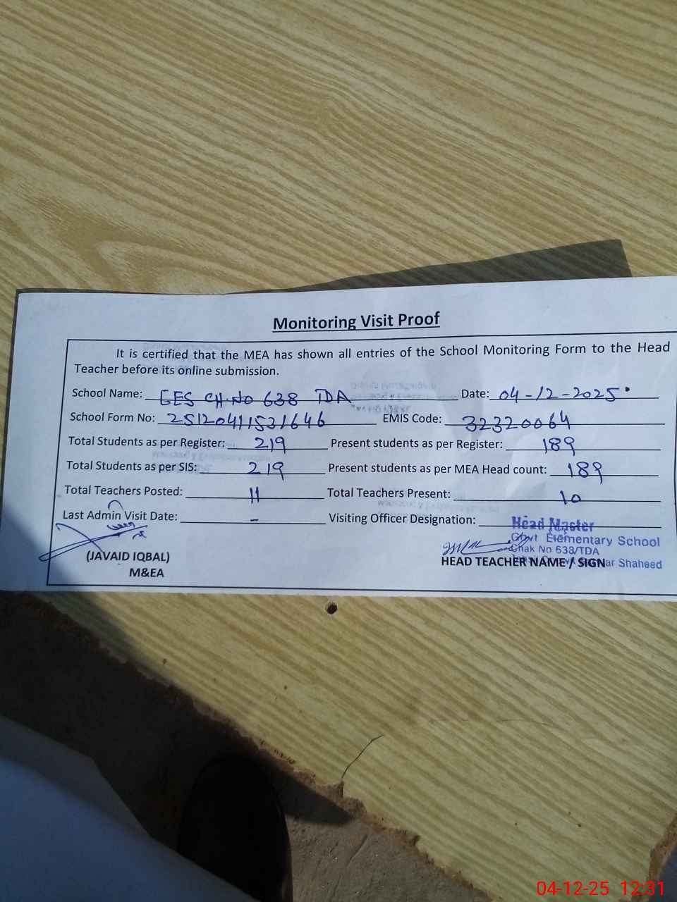 | EMIS Code: 32320064 | Name of School: GES CHAK NO. 638/TDA | |||