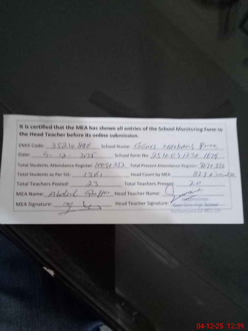 | Attendance Register | Head Teacher | MEA with School | Visit Proof |