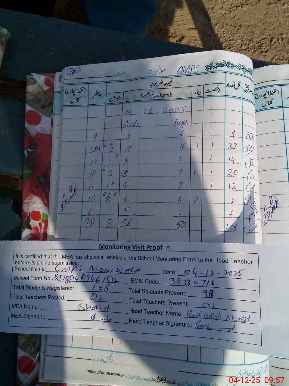 | Attendance Register | Head Teacher | MEA with School | Visit Proof |
