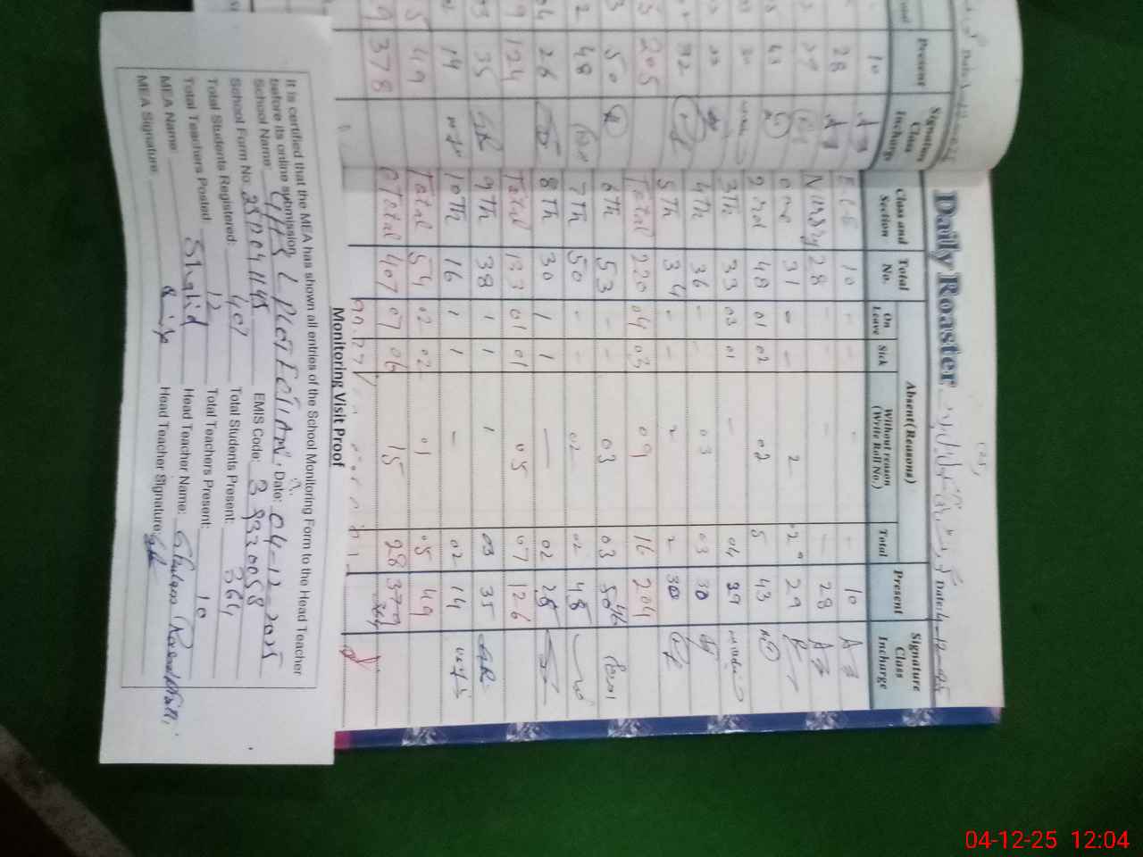 | Attendance Register | Head Teacher | MEA with School | Visit Proof |
