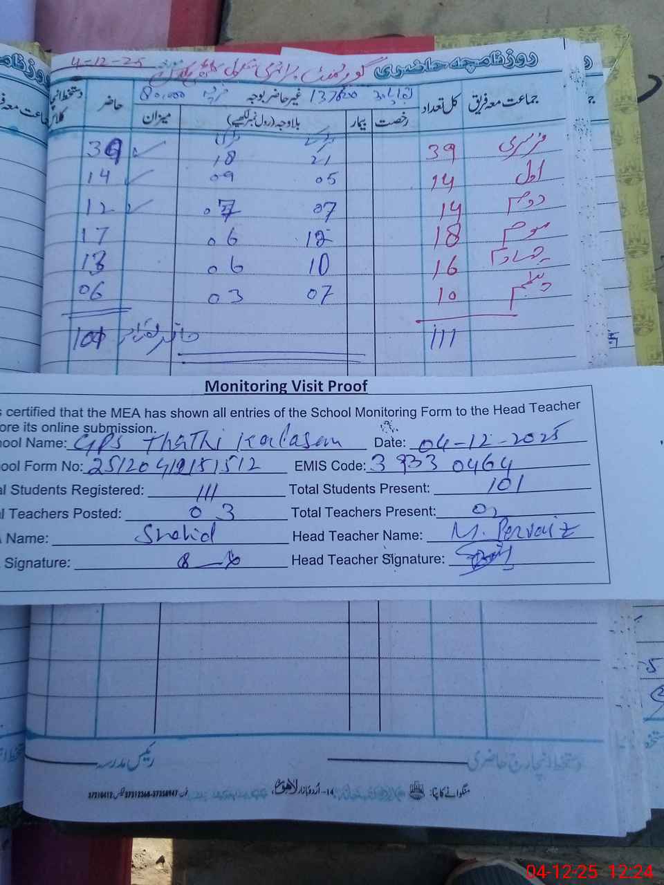 | Attendance Register | Head Teacher | MEA with School | Visit Proof |