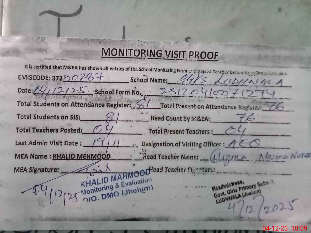 | Attendance Register | Head Teacher | MEA with School | Visit Proof |