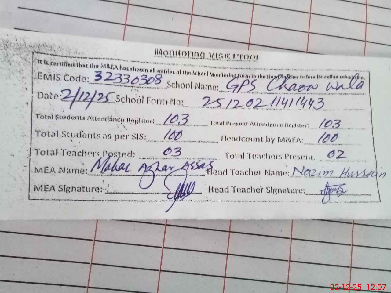| EMIS Code: 32330308 | Name of School: GPS CHAOW WALA | |||