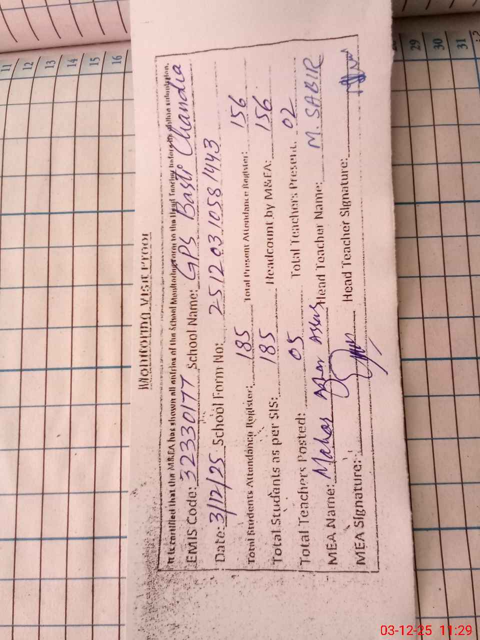 | Attendance Register | Head Teacher | MEA with School | Visit Proof |