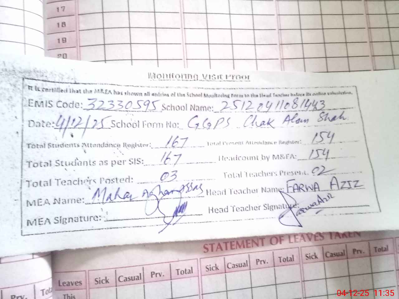 | Attendance Register | Head Teacher | MEA with School | Visit Proof |