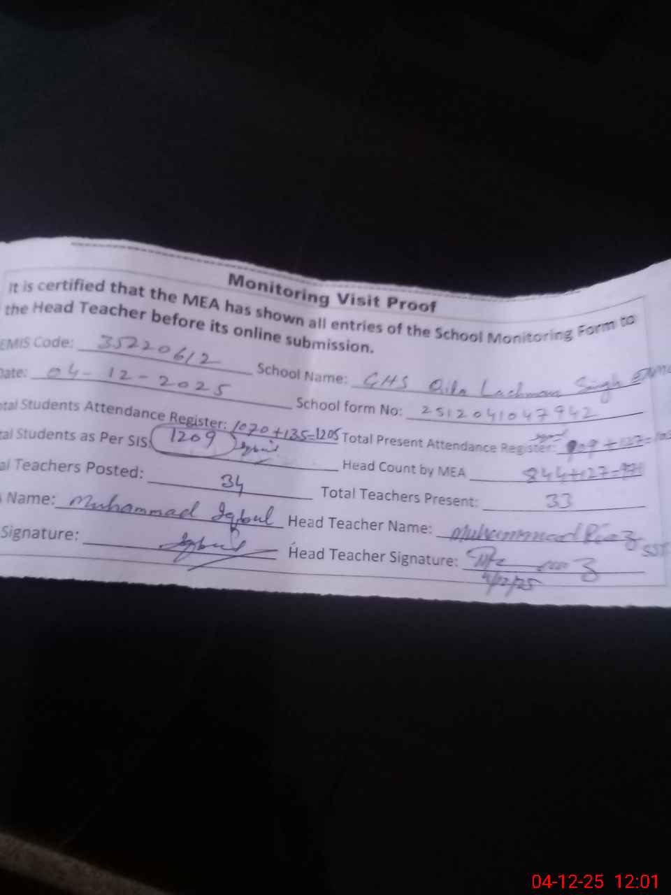 | Attendance Register | Head Teacher | MEA with School | Visit Proof |