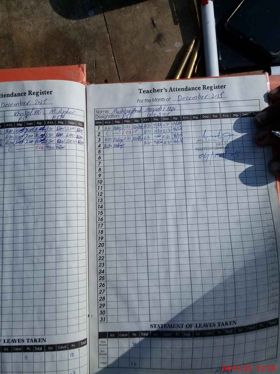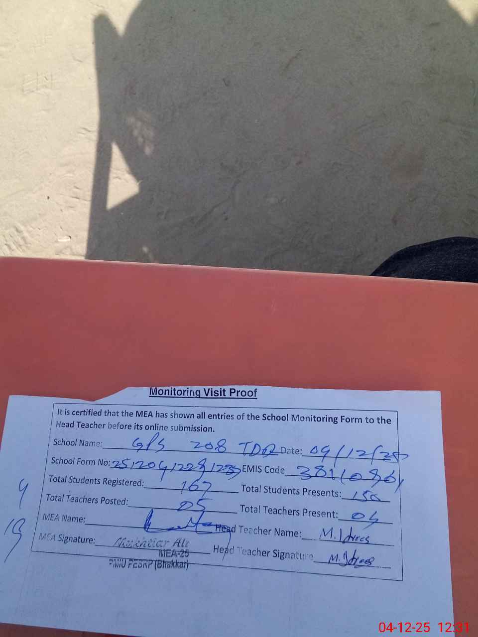 | Attendance Register | Head Teacher | MEA with School | Visit Proof |