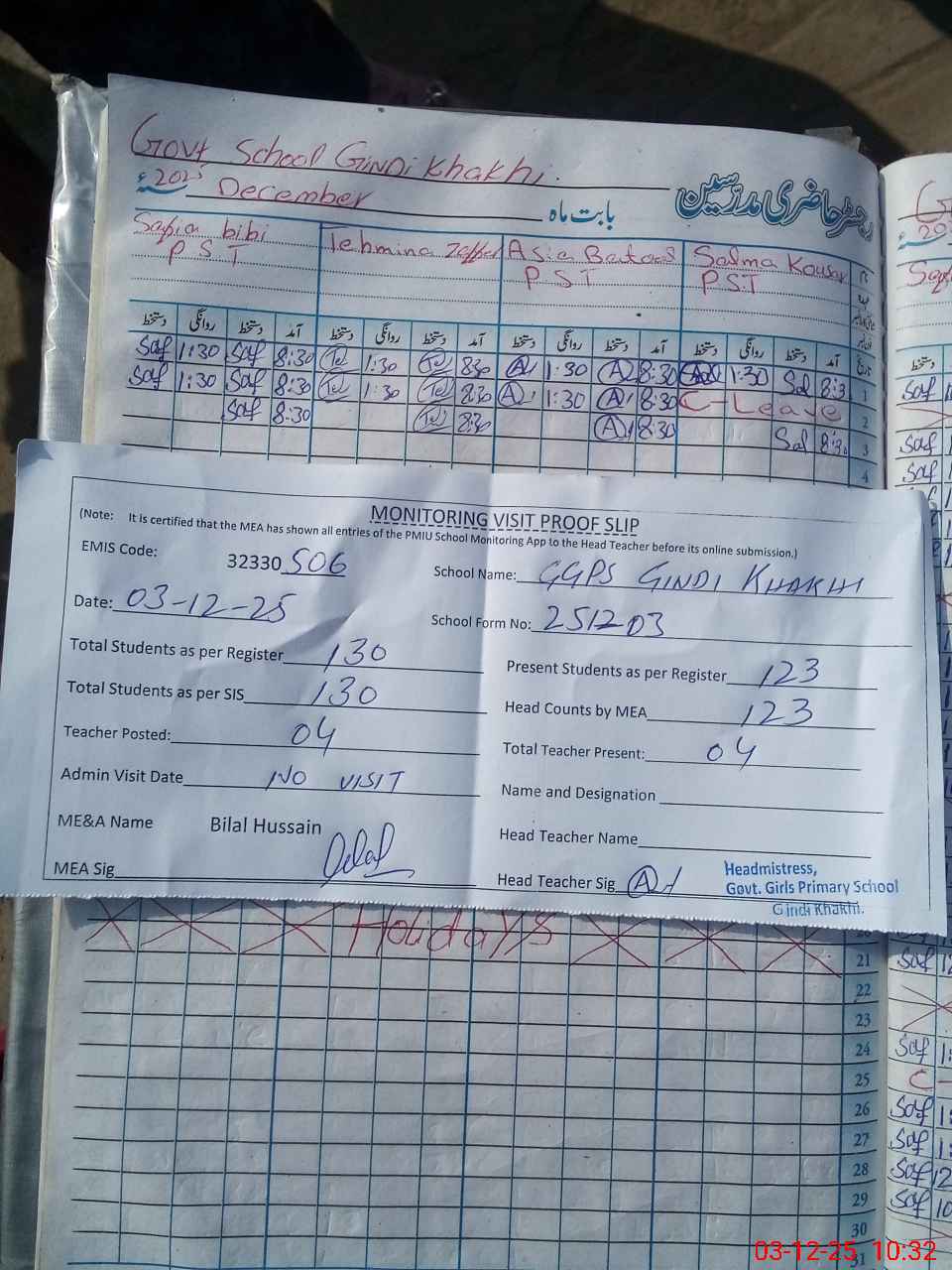 | Attendance Register | Head Teacher | MEA with School | Visit Proof |