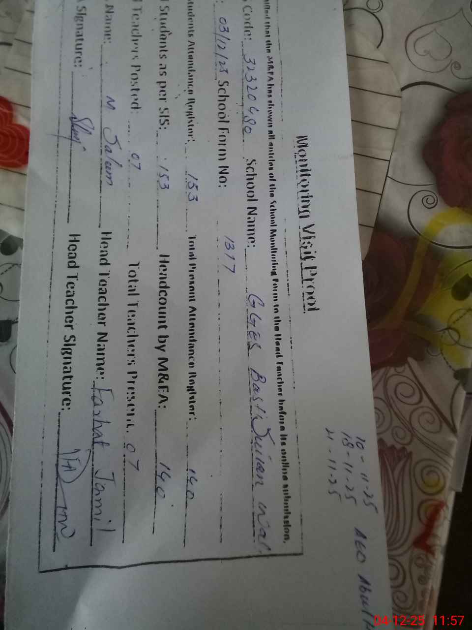 | Attendance Register | Head Teacher | MEA with School | Visit Proof |