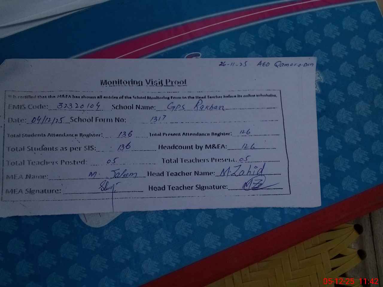| Attendance Register | Head Teacher | MEA with School | Visit Proof |