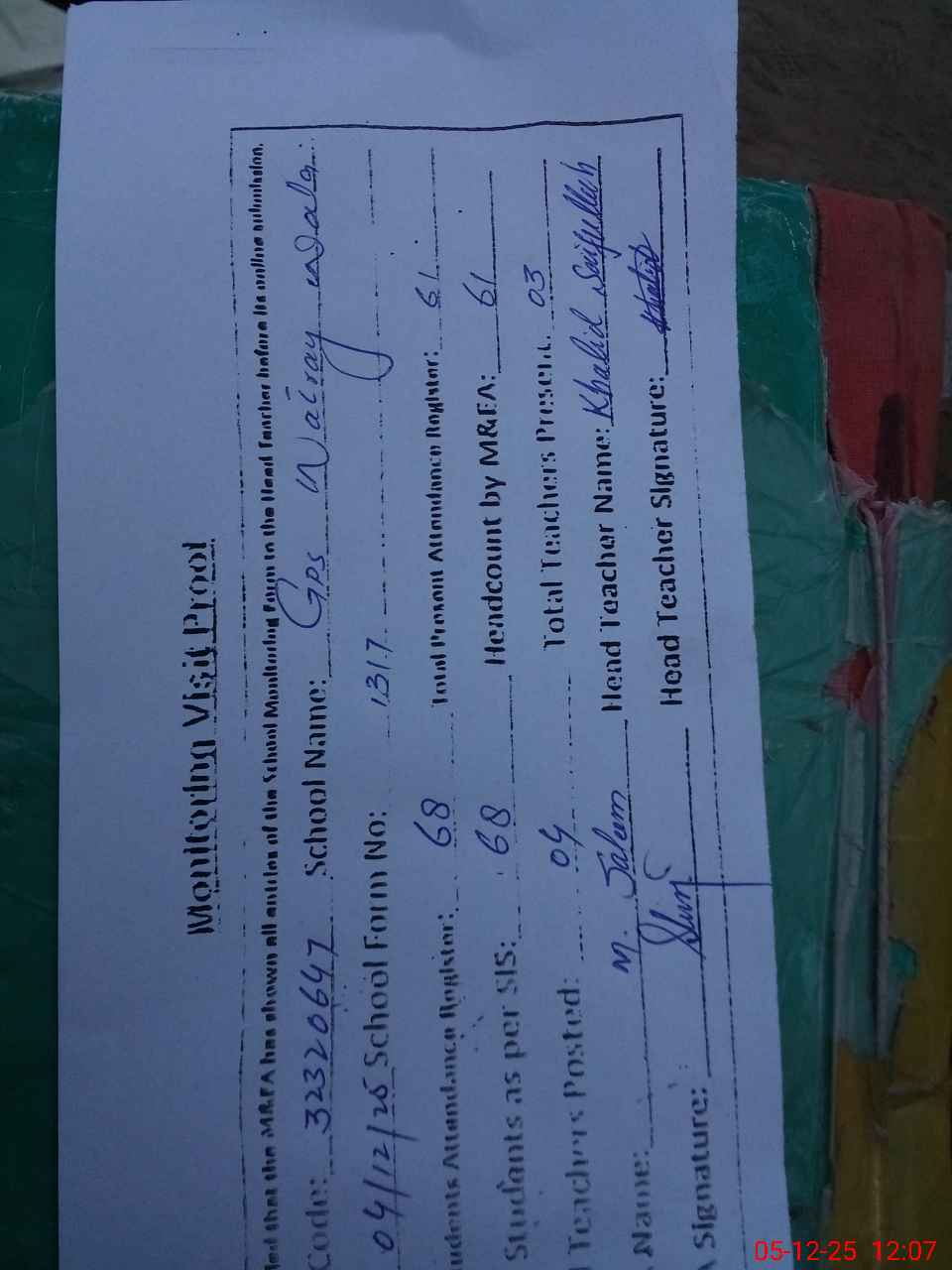 | Attendance Register | Head Teacher | MEA with School | Visit Proof |