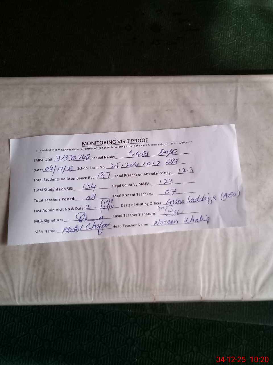 | Attendance Register | Head Teacher | MEA with School | Visit Proof |