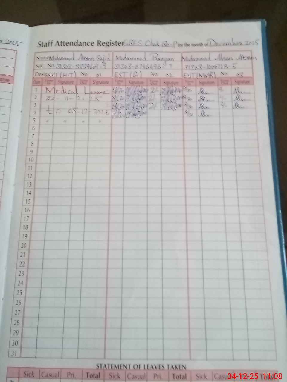 | CNIC | Full Name | Designation | R/C | Absence During Last Calender Month |